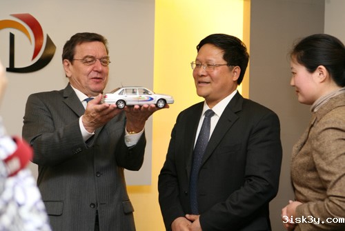会见结束后,汽车学院院长余卓平教授在中德学院大楼前广场向施罗德博士介绍了由我校自主研制开发的燃料电池汽车'超越三号'。