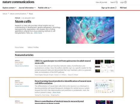 5月10日,我校附属同济医院脊柱脊髓损伤再生修复教育部重点实验室程黎明教授、朱融融教授在国际知名学术期刊《自然·通讯》(Nature Communications)上在线发表了题为“Deep learning-based predictive identification of neural stem cell differentiation”的研究论文,论文入选该杂志“干细胞”领域编辑推荐文章(Editors’ Highlights in ‘Stem cells’ area,https://www.nature.com/collections/pkgztbmgly)。