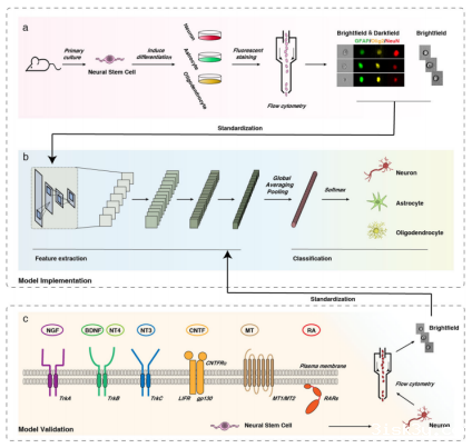 该研究构建了一种基于高通量流式单细胞成像技术的NSCs分化命运预测系统,并验证了其对于不同形式、不同作用机制诱导剂的作用下NSCs命运的预测效果。首先用流式细胞术标记获取不同分化方向的NSCs单细胞图像(图1a),再使用卷积神经网络(CNN)提取图像的特征,形成了一个结构良好的图像分类模型(图1b)。该工作构建的模型具有很高的普适性,包括实验室常用的神经营养因子、激素等,以及具有创新前沿性的纳米颗粒等。且该系统仅仅用明场单细胞图像评估,就能够在24小时的预判中获得很高的准确度(图1c)。