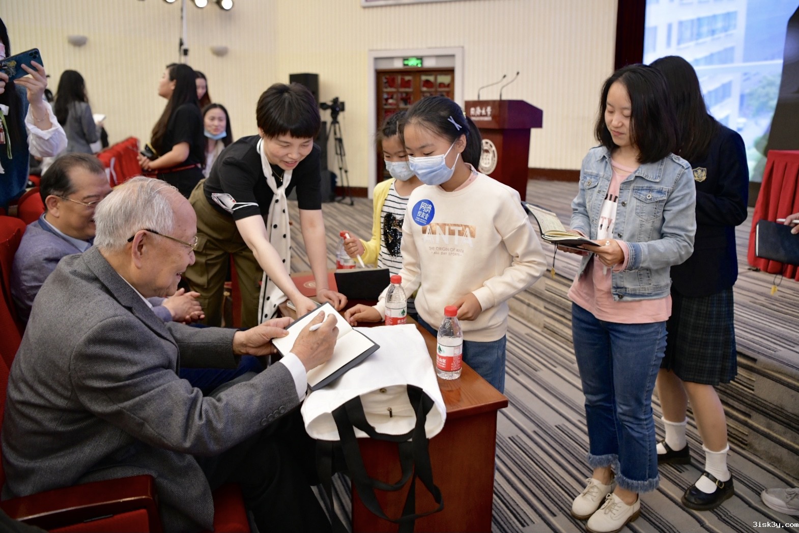 讲座开始前,部分校友已按捺不住激动的心情,自发到汪品先院士座椅前排队,等待签名。结束后,很多校友仍不舍离开,依旧排成长队,等候与院士合影、交流。此时讲完课的汪品先院士依然笑容可掬、神采奕奕,与校友们热情交流。他表示,希望通过演讲激发更多校友的科学热情和创新意识。他还特别与现场的小朋友进行了亲切交流:“我今天讲得有点深,能听懂吗?还有什么问题想问呢?”