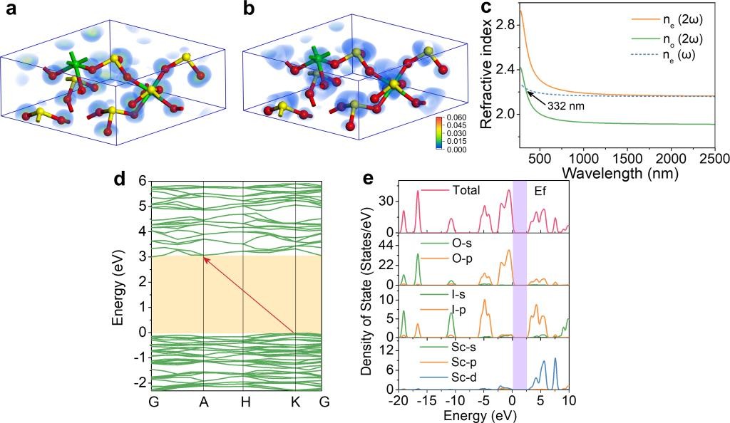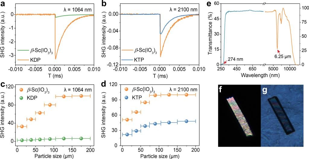 研究团队运用密度泛函理论方法,阐明了反应助剂和晶体成核前驱体间的相互作用是实现具有非心结构选择性的关键。碳酸与钪离子的结合的自由能高于水和钪离子的结合的自由能,但低于碘酸根和钪离子的的结合自由能。从反应热力学的角度出发,非心相前驱体内的脱碳酸过程是一个动态平衡的过程,非心相前驱体不会自发形成中心相前驱体。从反应动力学角度出发,非心相前驱体形成中心相前驱体的自由能势垒较高,增加了非心相中脱碳酸的难度。因此,碳酸可以阻止非心相β-Sc(IO3)3前驱体向中心相前驱体α-Sc(IO3)3的转化,并最大限度地促进非心相β-Sc(IO3)3的形成。单晶结构X射线衍射分析和倍频密度分析表明:反应助剂诱导了结构中碘酸根的优化排列,这些非线性光学活性基团产生叠加的二阶微观极化率,使得材料呈现出强的二次谐波效应和宽的带隙。实验研究显示,该稀土碘酸盐晶体β-Sc(IO3)3具有强的二次谐波效应(16.0 × KDP @ 1064 nm,2.2 × AGS @ 2100 nm)和宽的光学带隙(4.52 eV)。β-Sc(IO3)3同时表现出宽的光学透过范围(2.5~6.25 μm)、合适的双折射率(0.219 @ 546 nm)、以及优良的稳定性,是一例性能优异的中红外二阶非线性光学晶体材料。该项研究对于在碘酸盐体系中探索设计性能优异的中红外二阶非线性光学晶体具有重要的前瞻示范意义。