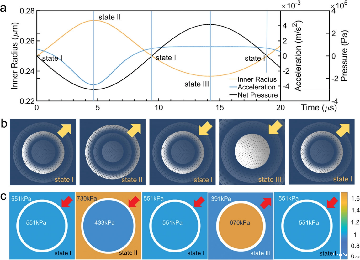 图3. 超声驱动下HMCS壳体运动的数值模拟。a) 一个周期内HMCS的内半径、外壳加速度和净压力的变化。 b) HMCS的状态示意图(箭头代表HMCS外壳的运动方向)。色条是由内表面归一化的压力值。