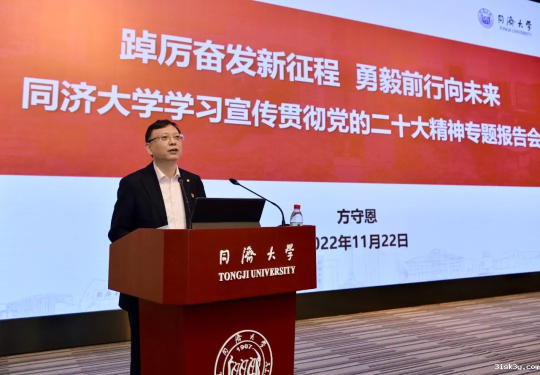 方守恩表示,作为一名高等教育工作者,深刻体悟到教育、科技和人才在全面建设社会主义现代化国家新征程中的特殊地位,深感使命光荣、责任重大。同济师生要深刻理解以习近平同志为核心的党中央对办好中国特色高等教育的重要指示和战略谋划,切实把思想和行动统一到党的二十大精神上来,把“两个确立”的政治共识转化为“两个维护”的行动自觉,全面贯彻党的教育方针,落实立德树人根本任务,走出一条建设中国特色世界一流大学的同济道路。方守恩结合同济人爱国奋斗、科教报国的典型事例,从三个方面分享了学习体会。他表示,学习党的二十大精神,就是要用新的伟大奋斗创造新的伟大业绩,以教育高质量发展支撑中国式现代化,承担好时代赋予的责任和使命。