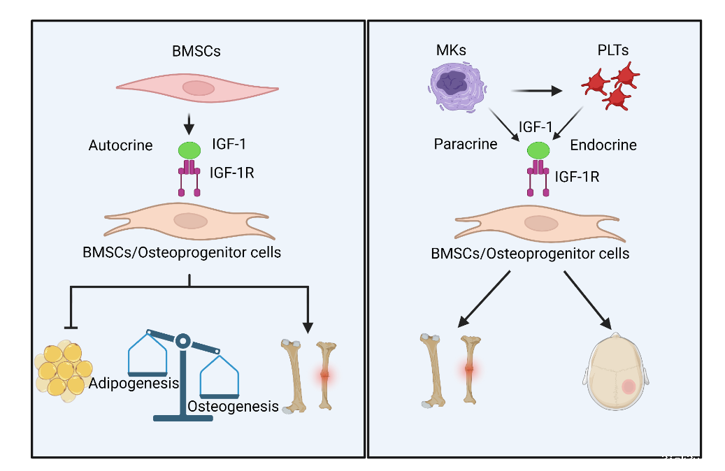 总而言之,本项研究系统探索了BMSCs和MKs/PLTs来源IGF-1对成体骨骼稳态维持和损伤修复的调控作用。BMSCs来源IGF-1以一种自分泌的形式平衡稳态和应激态下的成骨与成脂分化,而MKs/PLTs来源IGF-1则以一种旁分泌/内分泌的形式调控骨稳态和骨修复。这一研究成果不仅强调了骨髓来源IGF-1对成体骨骼维持和再生至关重要,而且发现了一种骨骼与血液系统对话的新型分子机制,并为促骨骼修复的血液制品优化与应用奠定了理论基础(图4)。