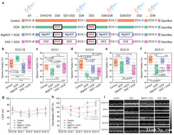 随后,研究团队探究了对于铁氰酸镁纳米催化剂及右雷佐生药物在防护给药模式下的小鼠心功能在体检测。在长约38天的检测日程中,研究人员对小鼠按日程进行了多次防护给药及急性心肌毒性建模处理,并在特定的时间点进行心超检测,监控其心脏功能。通过心脏超声的M超模式,测量并计算小鼠射血分数值EF作为其心功能的重要监察指标。研究发现,小鼠进行高剂量阿霉素药物的处理后,其射血分数值均有显著的下降,DOX药物处理组的平均EF值跌至50%以下,预示着较为衰弱的心脏射血功能,而经过3天防护性处理的小鼠(铁氰酸镁组或DXZ组),其心脏射血功能值能够维持相对的稳定,第二周期DOX药物处理后,DOX组小鼠显得较为虚弱,其心脏射血分数进一步降低,虽然铁氰酸镁组及DXZ组均有一定程度的下降,但在随后的心肌检查中,其EF值逐渐恢复至正常水平。研究人员对各组EF值进行了归一化处理,以更加真实反映各组小鼠抵抗DOX药物损伤的能力。研究发现,DOX处理组小鼠其EF在受激下降后,一直处于一个较低的相对水平,相较于DXZ药物防护组,铁氰酸镁防护组在整体考察周期内展示出更加优异的心肌防护水平(图4)。