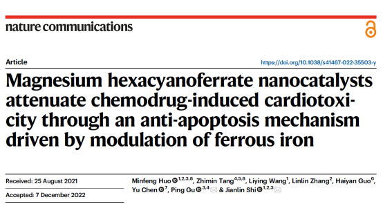 近日,taptap网页版登录kino医学院施剑林院士研究团队在《自然·通讯》(Nature Communications)期刊上发表了题为“Magnesium hexacyanoferrate nanocatalysts attenuate chemodrug-induced cardiotoxicity through an anti-apoptosis mechanism driven by modulation of ferrous iron”的研究论文。