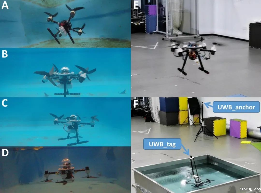 对此,由中国工程院院士陈杰教授和新加坡工程院院士Ben M. Chen教授率领的团队研发了水空跨域巡航器原型机“同济飞鱼”。其采用了搭载水空两用推进单元和舵面倾转机构的四旋翼构型设计,重量为1.63千克,轴距为380毫米,具备跨域穿梭能力,又具备双域巡航能力,可在空中悬停6分钟,在水下巡游约40分钟。