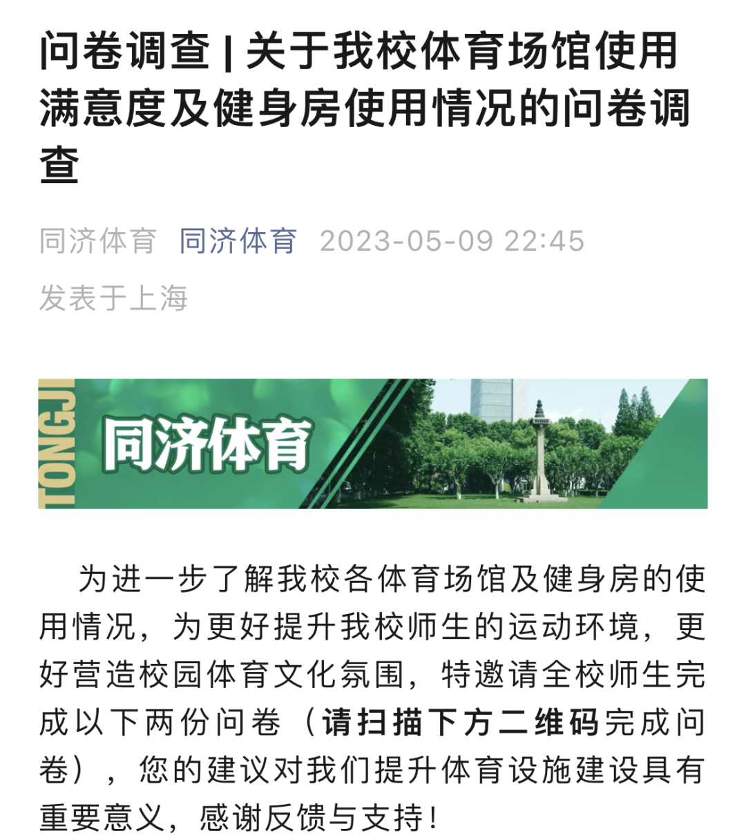 “您平常主要参加的体育活动类型有哪些?您对体育场馆的运动设施器材是否满意?”体育教学部面向全校师生发起了体育场馆需求和满意度问卷调查,针对师生的运动习惯、场馆预约、设施质量、安全保障、服务态度等方面进行了全面调研,后台反响热烈,师生们纷纷献计献策,上线第一天就收到意见建议1100余条。后续,学校将根据调研情况优化各类体育场馆的开放、教学和运营,充分发挥体育育人功能,服务师生强身健体之需。