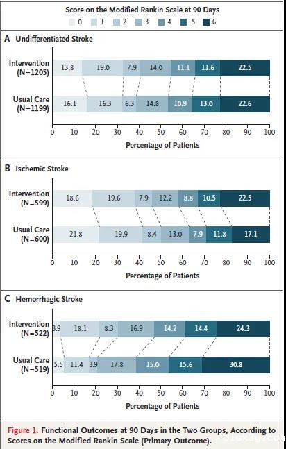 2020年3月到2023年8月是INTERACT4研究的入组阶段,共成功纳入2404名患者,其中1205名分配在强化降压组,1199名分配在标准降压组,每组分别有1185名和1177名患者完成了主要临床结局的评估(3个月mRS随访)。结果显示,对于所有疑似脑卒中患者,两组之间的3个月功能预后没有显著差异。但是,在出血性脑卒中(即脑出血)患者中,超早期强化降压显著降低了3个月功能预后不良的风险。相反,在缺血性脑卒中的患者中,院前降压增加了功能预后不良的风险。