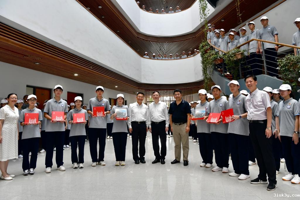 方守恩、尼冰、吕培明为2024级高一新生代表赠送taptap网页版登录kino专门为中学生订制的大学文化用品,并与2024级考入taptap网页版登录kino的8名学生进行亲切交流。