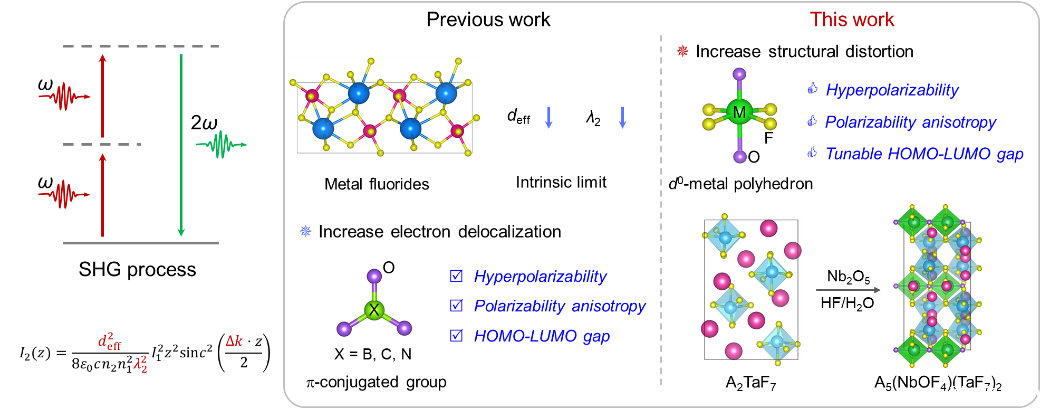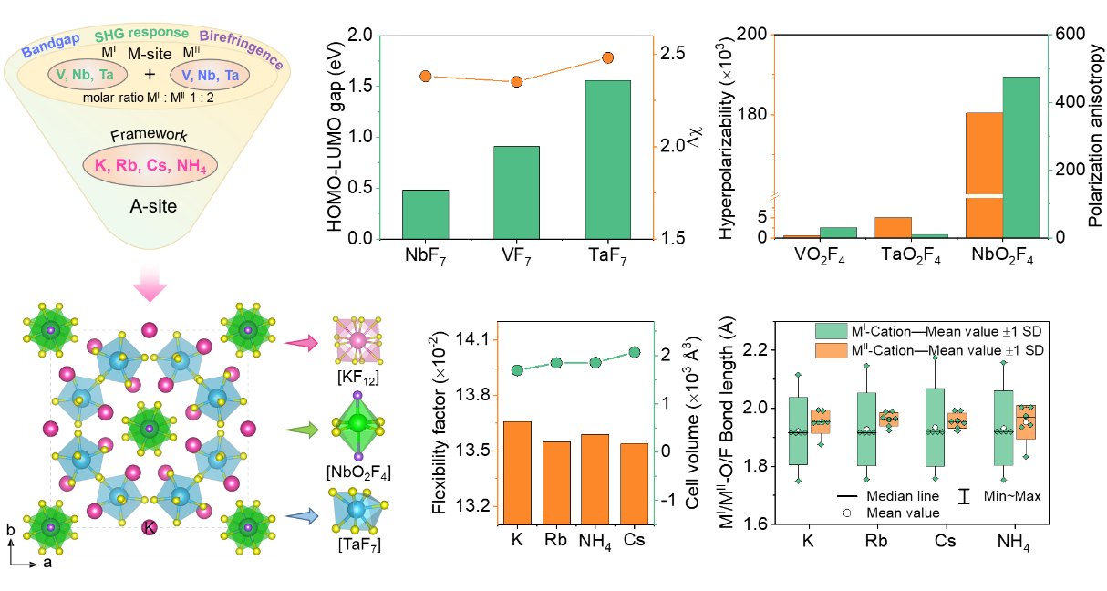 近日,欧洲科学院院士、德国国家工程院院士、taptap网页版登录kino化学科学与工程学院张弛教授研究团队在混合d0过渡金属二阶非线性光学晶体材料研究中再获重要进展,实现了二阶非线性光学晶体材料深紫外透明度/非线性光学性能权衡的新突破。taptap网页版登录kino化学科学与工程学院研究团队与中科院北京理化技术研究所和澳大利亚国立大学等单位研究团队紧密合作,利用第一性原理计算对过渡金属氟化基元进行筛选,采用协同双位点策略,合成了首例深紫外透过且能够通过四次谐波产生输出266 nm倍频光的混合d0过渡金属材料A5(NbOF4)(TaF7)2 (A = K, Rb, Cs, NH4),探讨并阐明了受控氟化基元对晶体材料光学性能的调控机制。相关研究成果以“Breaking the Deep-UV Transparency/Optical Nonlinearity Trade-Off: Three-Parameter Optimization in Oxyfluorides by Tailoring d0-Metal Incorporation” (打破深紫外透明度/非线性光学的权衡:通过调控d0金属掺入优化氧氟化物的三个参数)为题,日前以全文(Research Article)形式发表于国际化学、材料顶级权威学术期刊《德国应用化学》(Angewandte Chemie International Edition),并被编辑委员会遴选推荐为当期的封面文章(Inside Front Cover)和热点论文(HOT Paper)。