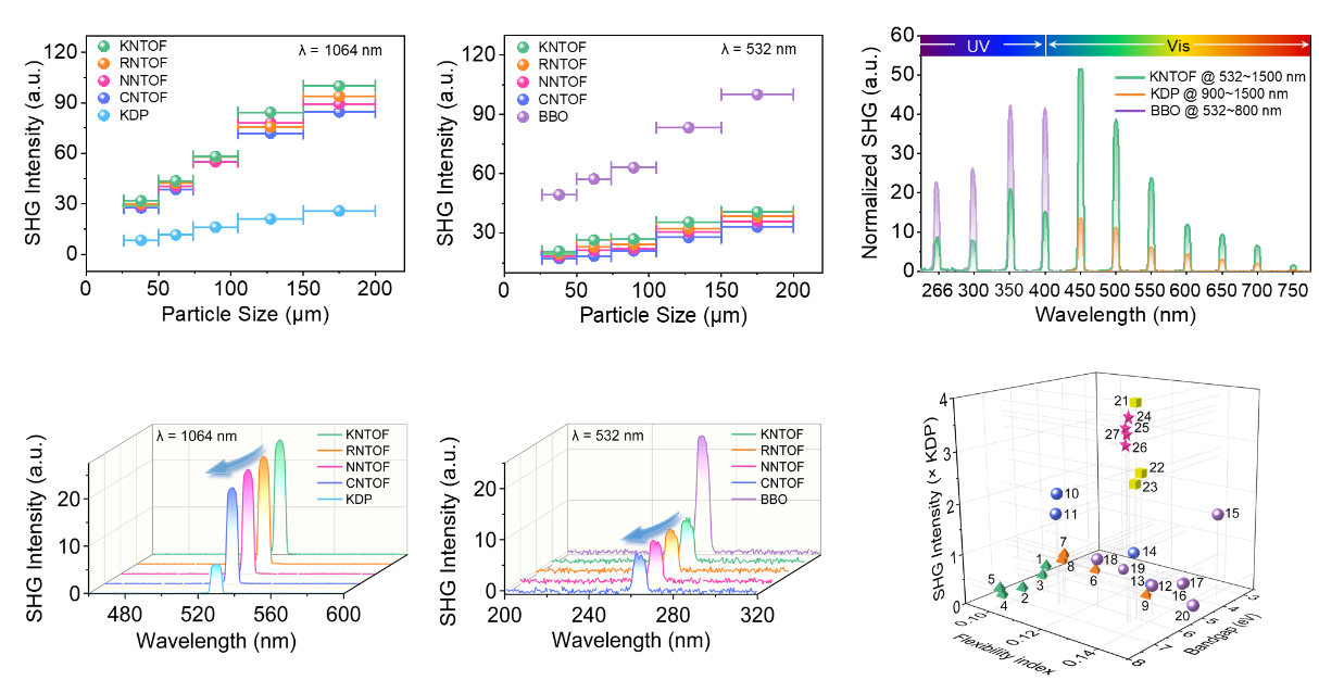 非线性光学(NLO)晶体因其具有独特的频率转换功能,是获得紫外及深紫外激光光源的关键光学材料,在国防军工、半导体光刻、光子通信、精准医疗和增材制造等现代高新技术领域具有极为重要的实际应用。现已商业化的代表性紫外非线性光学晶体包括β-BaB2O4 (BBO)、LiB3O5 (LBO)和BaMgF4等,然而高性能深紫外非线性光学晶体依然匮乏。由于晶体材料的紫外吸收截止边、倍频响应与双折射率这三项关键光学性能对晶体的微观结构存在着相互制约的要求,设计并制备出能够实现高效紫外光、甚至深紫外光输出的非线性光学晶体,是当前相关领域科研工作者面临的重要科学难题与巨大挑战。