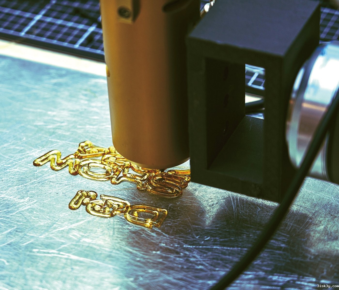 作品最具突破性的创新在于以AI程序控制的机械臂,革新了中国非遗“糖画”的创作方式。通过精准控制喷嘴温度与气流速度,机械臂将特制糖浆“打印”出现代字体,使固态糖经历液态塑形、半液态成型至最终凝固为“D&I GRAD SHOW 2024”字样。糖从固态被融化、被机械臂拉伸塑造、最终重新凝固成字的过程,恰如每一位毕业生在数年的学习中被知识重塑、历经磨练终获“成型”的生命轨迹。这种将物质转化、技术革新与生命成长巧妙勾连的深层隐喻,使得作品超越了视觉表象,触动了观众广泛的情感共鸣。