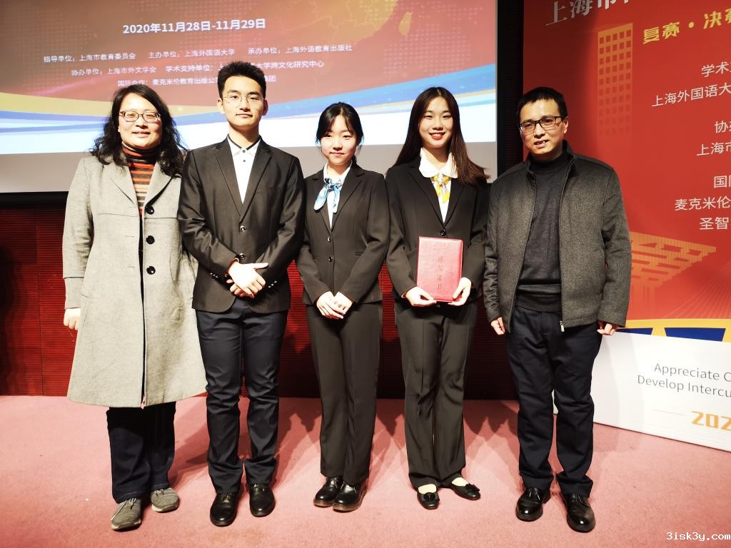 11月28日、29日,第五届“外教社杯”上海市高校学生跨文化能力大赛举行。我校外国语学院英语系2019级本科生金晓帆、鞠尧、谢秋雨组成的参赛队荣获大赛一等奖,总分位居第4。