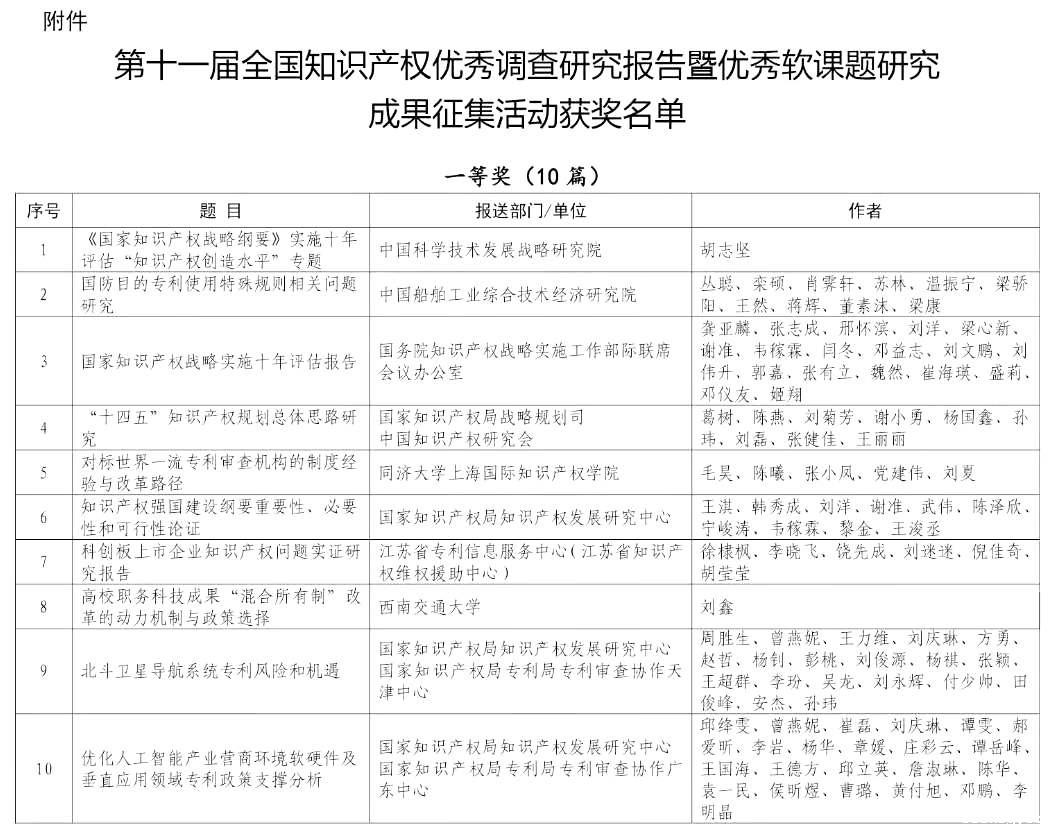 近日,国家知识产权局公布第十一届全国知识产权优秀调查研究报告暨优秀软课题研究成果征集活动获奖名单的通知,由我校上海国际知识产权学院毛昊教授主持的调查研究报告《对标世界一流专利审查机构的制度经验与改革路径》,荣获一等奖。