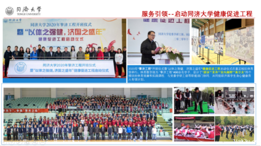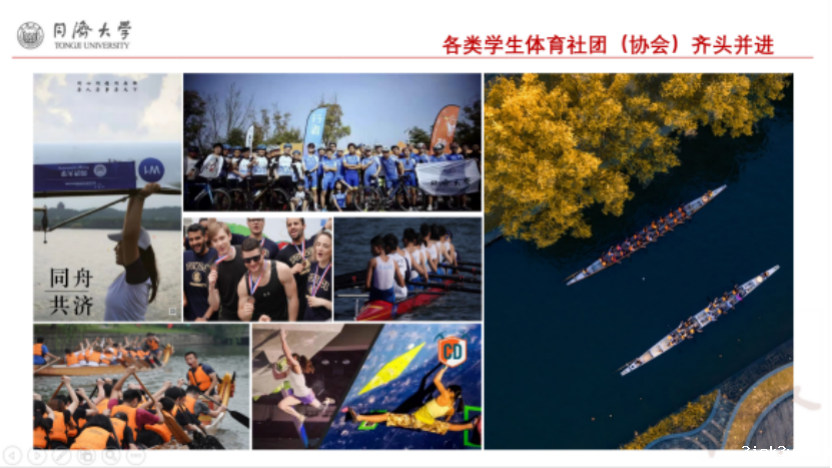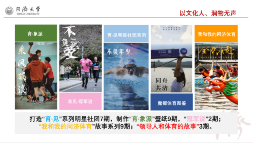 体育教学部还积极挖掘校园体育文化资源,打造“育·见”系列明星社团推介,推介学生体育社团,推广群众性体育运动;组织学生拍摄校内体育场馆、高水平运动队等内容,制作“育·象派”壁纸;组建团队采访同济体育冠军教师,推出“冠军说”栏目;收集同济学子的体育故事,打造“我和我的同济体育”系列,以文化人,传递青春正能量。