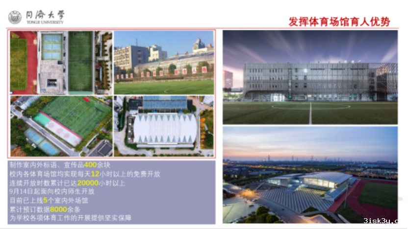 着力建设专业化体育场馆,发挥体育场馆的育人优势。体育教学部制作室内外标语、宣传品400余件,推广同济体育文化;做好疫情防控相关工作,校内各体育场馆自2020年9月14日起面向校内师生开放,实现每天12小时以上的免费开放,连续开放时数累计达20000小时以上;加快推进智慧体育场馆建设,研发场馆预订系统,目前已上线5个室内外场馆,累计预订数据8000余条,为学校各项体育工作的开展提供了坚实保障。