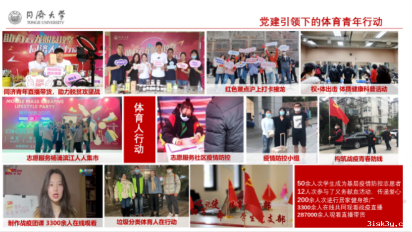 坚持以党建带团建,激发青年活力。行政管理班学生、国足门将颜骏凌倾情助阵带货直播,以购代捐,以实际行动助力对口支援的云龙县完成脱贫攻坚任务。面对突如其来的新冠肺炎疫情,同济优秀体育健儿展现了青年的力量与担当。