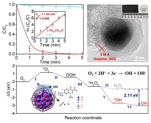 赵国华教授、赵红颖教授团队在研究工作中,提出了电催化还原分子氧产生∙OH的新方法,构筑具有碳层包覆合金结构的一体化铁钴碳气凝胶(FeCoC)阴极,该电极具有高比表面积、高空间利用率、高导电性、且易直接成型等优异电化学性能。研究表明,电催化还原分子氧的活性位点位于石墨碳层表面,首先发生两电子电催化氧还原产生H2O2,进而H2O2单电子电催化还原产生∙OH。通过原位气压测试验证了整个分子氧还原为电化学过程,表观电子转移数为3.1。不同于传统芬顿反应,整个分子氧还原为电催化过程,电催化活性位点在石墨碳层表面,铁钴合金被保护在碳层内部,不仅避免与外界溶液接触反应,无金属离子溶出,不产生铁泥,还克服了传统芬顿反应Fe(II)/Fe(III)价态循环慢的速率控制,将该电催化还原分子氧能在宽pH(3-11)范围保持HO•的高产生效率。将该方法应用于有机污染物的降解,5 分钟内可完全降解污染物,且电极循环稳定性优异,具有良好的应用前景。同时,该团队通过X射线吸收近边结构光谱、近边X射线吸收精细结构光谱、电子顺磁共振波谱、原位气压法、线性扫描伏安法以及密度泛函理论计算对电催化还原分子氧选择性产生∙OH的分子机理进行了深入探究。该研究工作提出的界面电子调控选择性电催化还原分子氧产生∙OH理论体系,为有毒有害有机污染物的绿色、高效氧化降解新方法的研究和应用提供了重要理论基础,拓展了环境水处理技术。