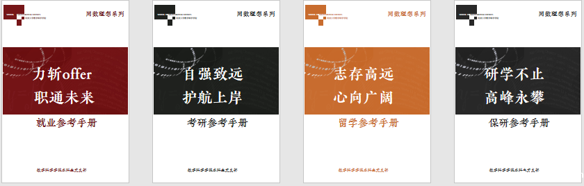 数学科学学院本科生党支部聚焦“生涯领航”进行了更深入的探索。“交流会目前的辐射影响力有限,我们想通过一种开源共创的方式,把最精华的部分沉淀下来,并且能够代代相传,让更多的同学看得到、用得着。”支部书记说。在线下交流会的基础上,支部动员党员和优秀的毕业生启动了“同数理想系列”朋辈互助行动,共创形成“力斩offer,职通未来”就业主题、“自强致远,护航上岸”考研主题、“研学不止,高峰永攀”保研主题和“志存高远,心向广阔”留学主题四本参考手册,为同学们成长发展提供了可资借鉴的宝贵经验。