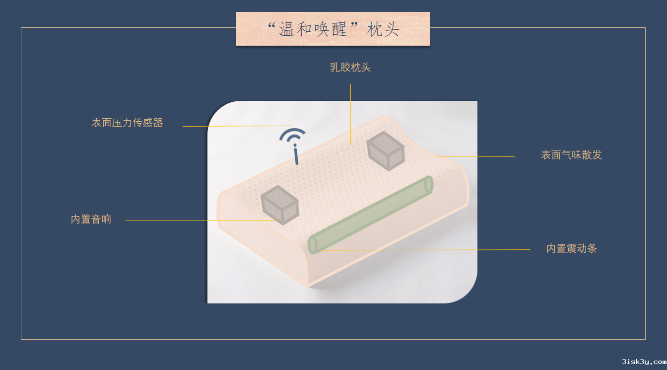 早上闹钟响起,没把自己叫起来却先把舍友吵醒?闹钟响了几个小时,关了闹钟照样呼呼大睡?你或许会需要一个“温和唤醒”枕头。App上设置闹钟时间,枕头内部的小音箱接触身体传音,同时配有震动条震动、气味散发等物理作用将你温和唤醒。枕头表面的压力传感器控制闹钟开关,只有头离开枕头一定时间才能认定闹钟关闭,所以别想再睡回笼觉。——交通运输工程学院冯蕊
