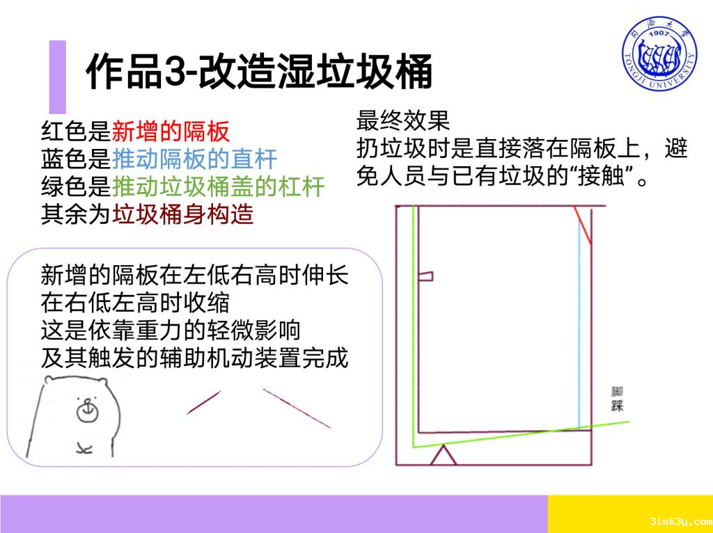 垃圾分类已成为常态,垃圾桶的构造可能会影响扔垃圾的意愿和心情,比如扔湿垃圾时,人们不想看到桶内已有的垃圾;扔入不太满的桶时容易溅出汤汁;合盖时,桶内已有垃圾的气味被盖子“扇”到面前,非常难闻……针对现存湿垃圾桶的诸多不便之处,我设计了这款简易的湿垃圾桶。——测绘与地理信息学院郭美杉