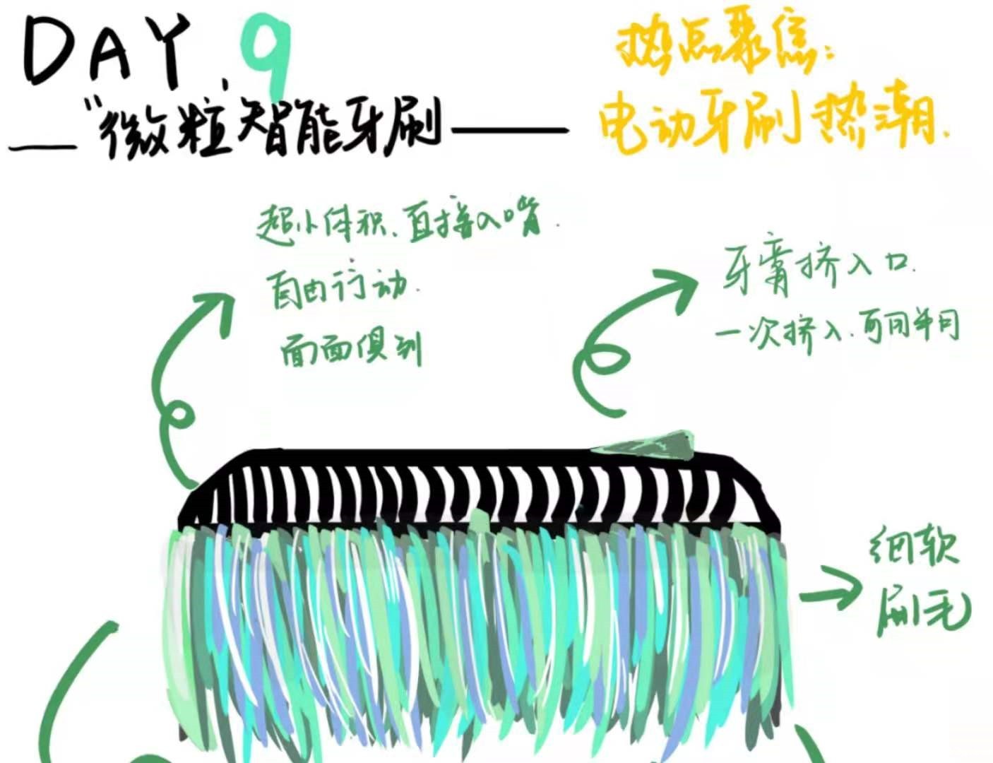 运用triz理论的减少法和类比法,减少了原本牙刷的刷柄,只保留下刷头,并将其缩小至口香糖大小,直接放入嘴中即可进行自动洁牙。采用吸尘器原理,刷出的污垢立即被吸走,从而保证口腔内环境的干爽。随时放入口中便可使用,不必固定在洗漱室。与APP相连接,产品内置镜头可以在APP上反馈牙齿健康状况。——新生院同心学堂创新创业+实验区傅瑜