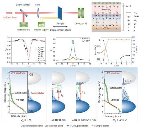 该研究团队通过施加电压调控氧化钨(WO3-x)薄膜中W的价态,可诱导薄膜体现饱和吸收和反饱和吸收等截然不同的非线性光学响应特征。在1030nm激光激发下,薄膜非线性吸收系数可达‒632cm GW-1(‒2.5 V电压),是未处理样品非线性吸收系数(18cm GW-1)的35倍。同时在800nm和515nm激光激发下,氧化钨薄膜也体现出电压相关的非线性吸收行为。薄膜非线性吸收性能的调控源于与W相关的带间缺陷态位置和数量变化。相关成果“Switching the Nonparametric Optical Nonlinearity of Tungsten Oxide by Electrical Modulation”日前发表于光学材料领域重要期刊《先进光学材料》(Advanced Optical Materials, 2021, 9, 2002188)。