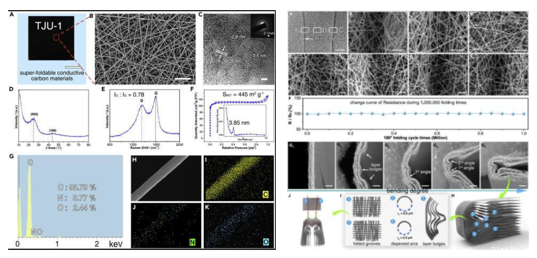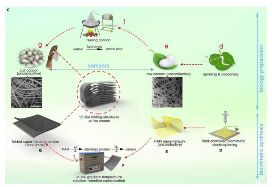 该论文运用蚕茧仿生思路,首次设计制备出能够经受百万次以上无损真折叠的网络碳材料,实现了超折叠导电材料的突破;首次阐明了导电材料折叠过程中的应力分散机理,为其它超折叠导电材料的设计制备指明了方向,为折纸式手机/电脑一体化设备等超柔性电子器件的问世带来了新的曙光。