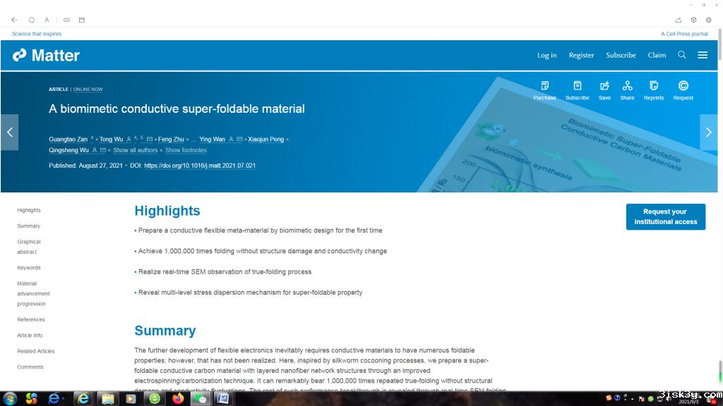 鉴于此,我校化学科学与工程学院吴庆生教授和吴彤特聘研究员领衔的研究团队在通过化学键理论创建本征导电材料不可折原理基础上,应用超材料设计思想和仿生设计思路,使用改进的静电纺丝/梯度碳化技术,首次仿生制备了一种可承受100万次乃至无限次真折叠而无任何损伤的超折叠导电碳材料(SFCMs),这实际上是一种导电柔性超材料(meta-material)的问世。通过自建的实时SEM折叠系统观察研究以及力学模拟分析,揭示了SFCMs折叠过程中的多级应力分散机制,为其它超折叠材料和器件的设计制造指明了方向,具有重大的科学意义和广阔的应用前景。其相关工作以“A biomimetic conductive super-foldable material”为题发表在Cell姊妹刊Matter上(Matter,2021,DOI:10.1016/j.matt.2021.07.021)。