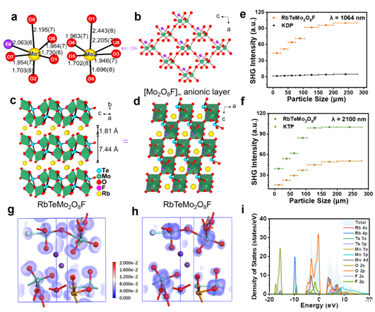 在这一研究中,研究团队提出了一种部分氟取代策略,以增加孤对氧阴离子基过渡金属氧化物的结构畸变。他们通过用电负性更高的氟离子来取代结构中一半过渡金属中心八面体上的一个氧位点可导致费米能级附近电子态密度的改变从而实现光学带隙的提升,同时产生了层状结构中两种均匀交替连接的极化[MoO5F]和[MoO6]八面体,其中氟离子作为结构导向因子,使得层状结构中共边连接的[TeO4]多面体上的孤对电子优先朝一个方向排列,从而形成具有最大化倍频活性的宏观极性化合物。基于这一部分氟取代的策略,成功设计合成了第一例由三种倍频活性基元[MoO5F]/[MoO6]八面体和[TeO4]多面体组成的二维结构部分过渡金属中心八面体氟代亚碲酸盐晶体材料。在此基础上,运用X射线衍射单晶结构分析并结合密度泛函理论方法进行模拟计算,进一步探讨并阐明了RbTeMo2O8F的倍频效应和光学带隙同步增益的内在物理机制,提出了有利于获得强倍频效应和宽光学带隙的主要原因是高电负性氟离子的引入(部分氟代)以及三种极化活性单元[MoO5F]/[MoO6]八面体和[TeO4]多面体的最优有序排列和密集堆积。该部分过渡金属中心八面体氟代亚碲酸盐RbTeMo2O8F表现出可见和中红外波段巨大的倍频效应(27 × KDP @ 1064 nm;2.2 × KTP @ 2100 nm),其倍频强度为目前已发现的无机亚碲酸盐体系最大值;RbTeMo2O8F的光学带隙(3.63 eV)超过了目前绝大部分已报道的过渡金属亚碲酸盐。该研究为新型高性能非线性光学晶体材料的设计创制提供了一个全新的示范。