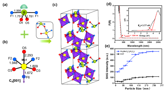 非线性光学晶体材料是应用激光频率转换技术实现激光器光源向未开发波段扩展的关键性元件,其中中红外(3-5 μm)激光材料在激光医疗、军事通讯、半导体光刻等众多先进激光技术领域具有重要的科学价值和广阔的应用前景。目前,硫族化合物AgGaS2、AgGaSe2和ZnGeP2作为商业化的中红外非线性光学晶体具有优越的倍频效应和红外透射范围,但普遍存在着带隙窄、激光损伤阈值低和双光子吸收等缺点,严重限制了它们在高端激光技术中的实际应用。而基于孤对电子氧阴离子的金属氧化物往往表现出较大的激光损伤阈值和良好的晶体生长习性,却无法同时满足强倍频效应(>10 × KDP)和宽光学带隙(>3.5 eV)两个相互矛盾的固有结构性要求,因此如何获得倍频效应和光学带隙同步显著优化增益的氧化物晶态材料是当前中红外非线性光学材料研究中一个极具挑战的科学难题。