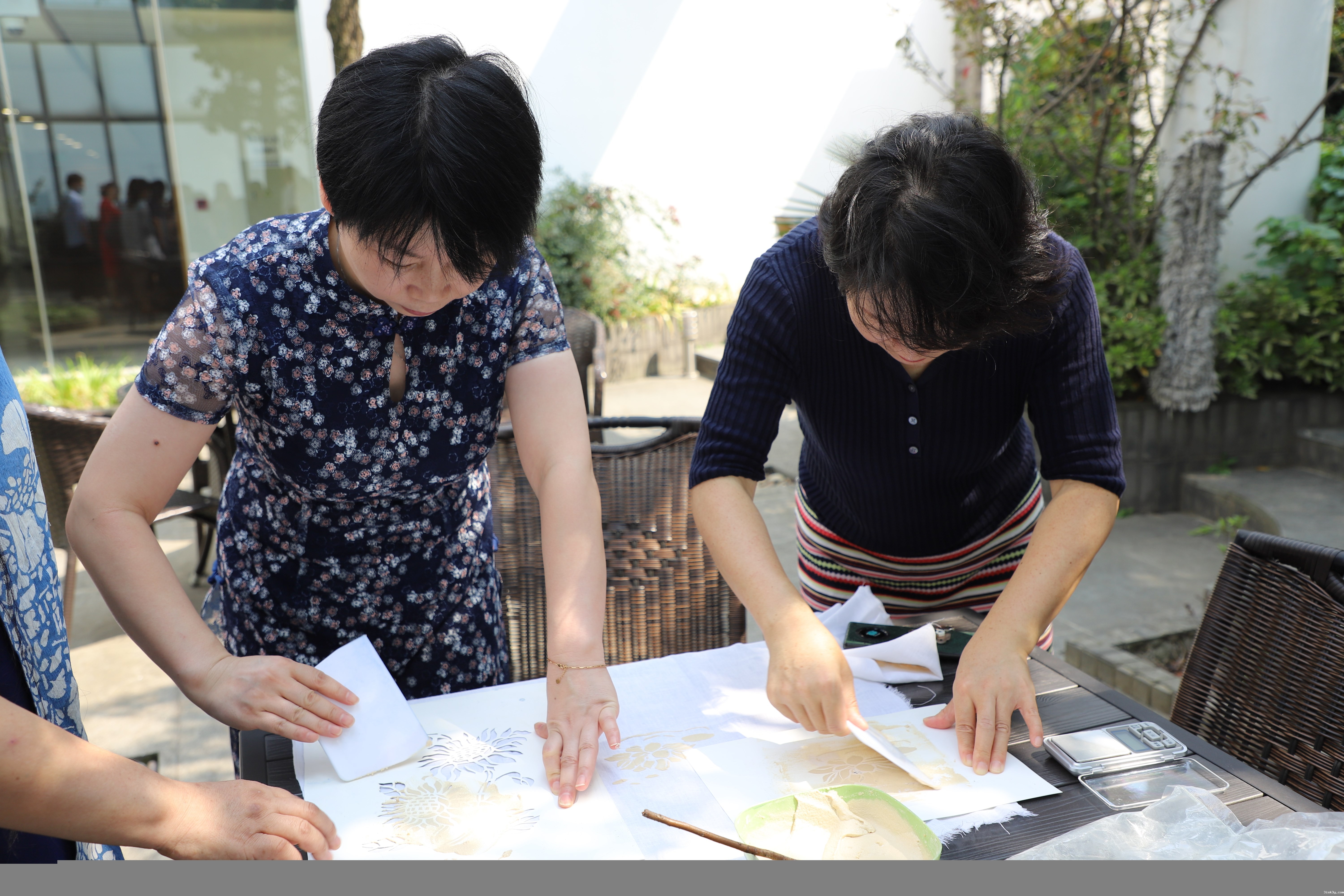 随后,嘉定校区各学院师生代表参观了展览。在体验环节,柳玉成从制作原料、染色原理、刮糊手法等方面进行讲解和示范,带领师生现场制作了自己的“药斑布”成品。师生们挑选中意的图案,带上印染工坊专用的围裙手套,通过刮糊、浸染、上色,感受传统文化技艺的精湛和雅趣。