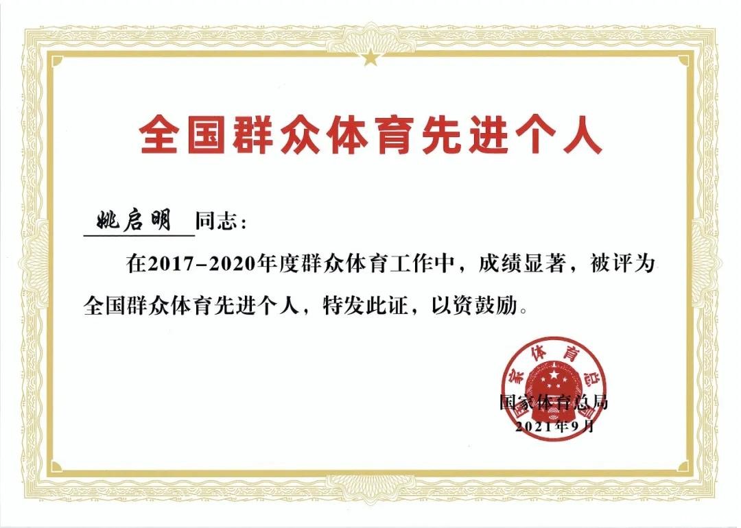 姚启明荣获“2017-2020年度全国群众体育先进个人”称号