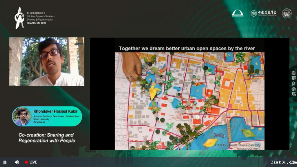 Khondaker Hasibul Kabir的演讲关注建筑师的社会责任。他介绍了自己在孟加拉开展的一系列“共创”项目。这些项目将社区的居民召集起来,通过绘制街区地图等方式,让社区居民参与社区规划。大家共同探讨哪些节点需要改造,居民自发地提出设想,建筑师为这些设想提供实现的策略。通过这些方式,为当地社区创造公共空间和社会福利。
