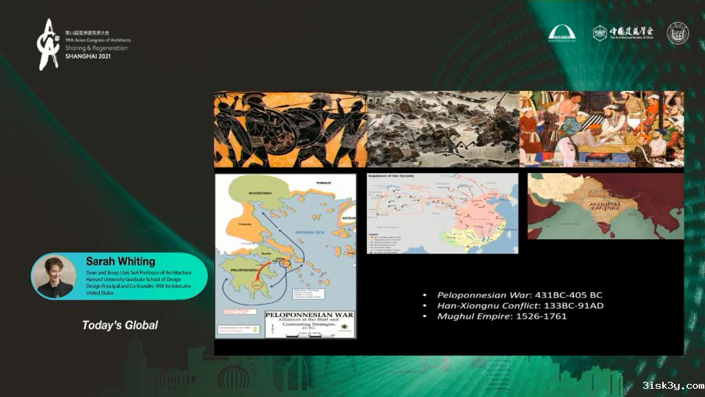 Sarah Whiting在演讲中回顾了全球化的发展历程。她认为,工业革命后,技术和互联网驱动了全球化,随着全球化的发展,世界连成一体。这是一种新的和平的全球化。而2008年的金融危机与2011年的占领华尔街等运动却导致了全球化的局部倒退。她通过哥本哈根的城市广场、巴黎的清真寺等案例,对全球化的未来会如何发展、设计师在新的全球化过程中扮演的角色等问题提出了自己的思考。