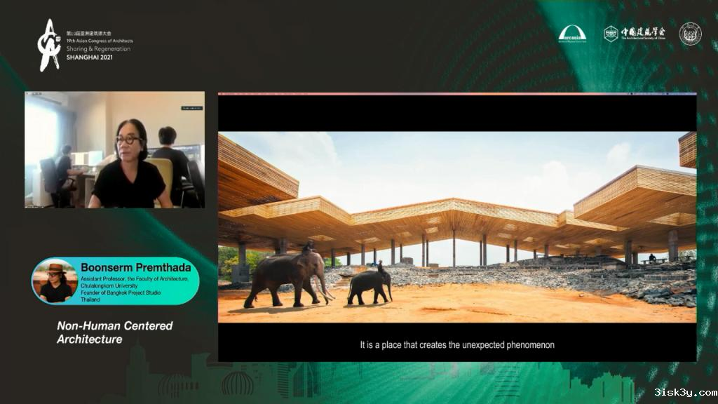 Boonserm Premthada的演讲聚焦如何为动物创造空间、实现人与自然的和谐相处这一有趣的话题。他指出,当前的建筑设计总是把人放在一切的中心,人的需求应该和自然以及其他生物的需求结合起来一起考虑。他介绍了自己一项特殊的实践作品——一个为大象设计的博物馆,认为大象不是我们的奴隶,而是我们的家人。这个建筑的内部空间同时兼顾人和大象的尺度,还为大象提供了专门的流线。人文关怀不应仅仅存在于人与人之间,同时也存在人与世界万物之间。