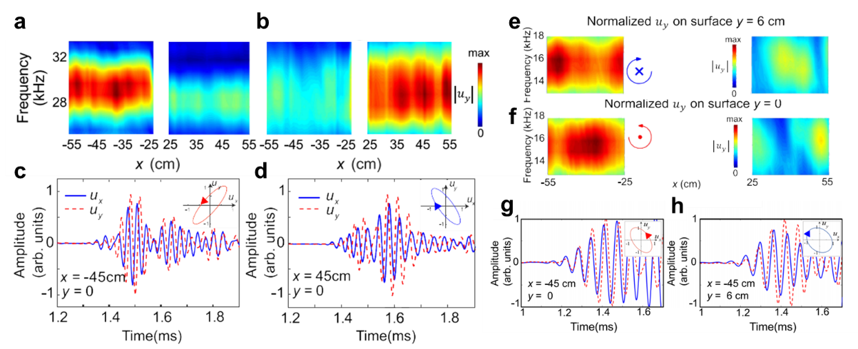 图2展示了源选择性激励时自旋-动量锁定的单向传输和弹性波自旋观察。在图2a中,自旋正的波源激发了向左传输的弹性波,在左侧测量到的表面上的自旋为正(图2c)。在图2b中,自旋负的波源激发了向右传输的弹性波,在右侧测量到的表面上的自旋为负(图2d)。在兰姆波系统中,在自旋正的波源激发时,在窄板的前表面(图2f)和后表面(图2e)上均观察到了向左传输的弹性波,但对应的自旋极化相反,分别为正(图2g)和负(图2h)。