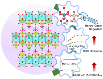 与上述π-共轭深紫外二阶非线性光学晶体相比,非π-共轭基元构筑的深紫外二阶非线性光学晶体可表现出更短的紫外吸收截止边,然而已报道的绝大多数非π-共轭深紫外二阶非线性光学晶体存在着二阶非线性光学效应弱等不足。针对这一科学难题,张弛院士研究团队以非π-共轭硫酸盐为研究对象,提出了一种复合阳离子盐策略,构建了一例具有强倍频效应的稀土基硫酸盐深紫外二阶非线性光学晶态材料相关成果“A Lanthanum Ammonium Sulfate Double Salt with a Strong SHG Response and Wide Deep-UV Transparency”(一种具有强倍频响应和宽深紫外透过的硫酸镧铵复合盐)日前以Communication的形式在线发表于《德国应用化学》(Angew. Chem. Int. Ed., 2021, DOI:10.1002/anie.202115855)上,并被Angewandte Chemie编辑委员会遴选为Hot Paper这已是张弛研究团队今年第七次连续在国际化学顶级期刊上发表系列重要研究成果。