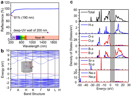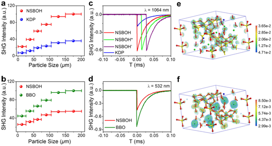 在这项研究中,研究团队基于硼酸盐溶液化学合成方法,以深紫外二阶非线性光学晶体NaSr3Be3O9F4 (NSBBOF)为结构模型,采用共价键调制策略,在材料中实现四面体基元[BO4]和[BeO3F]的同位点取代,最终获得去铍的硼酸盐晶态材料。高浓度的硼酸盐溶液有利于[BO3]/[BO4]基团聚合成高核的B-O簇,进一步构筑成具有三维结构的共价框架,这种三维结构可赋予材料大的光学带隙,使晶态材料实现更高的紫外透过率。基于这一共价键调制策略,研究团队成功设计合成了一例由[B9O19]簇组成的无铍羟基硼酸盐。光学实验研究显示,该NSBOH晶体具有良好的物化稳定性,其紫外吸收截止边小于190 nm,与理论紫外吸收截止边178 nm相吻合。NSBOH在可见光和紫外光波段内同时具有强的倍频响应(3.3 × KH2PO4 @ 1064 nm,0.55 × β-BaB2O4 @ 532 nm),为深紫外硼酸盐晶态材料的最大值,是一例性能优异的深紫外二阶非线性光学晶体材料。这一研究对于在羟基硼酸盐体系中探索设计性能优异的深紫外二阶非线性光学晶体具有重要的前瞻示范意义。