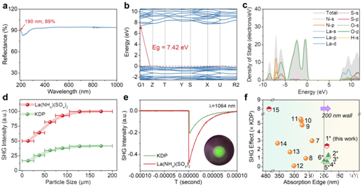 研究团队还应用单晶结构分析并结合第一性原理理论模拟计算,进一步探讨并阐明了La(NH4)(SO4)2可实现大倍频效应和宽紫外透光范围两者平衡的内在物理机制,揭示了材料有利于获得强倍频效应和宽紫外透过范围的主要原因是有机铵和稀土阳离子La3+的协同作用及其诱导非线性光学活性基团[SO4]和[LaO8]的一致排列。该稀土基硫酸盐La(NH4)(SO4)2表现出短的紫外吸收截止边(实验值:˂ 190 nm;理论值:167 nm);La(NH4)(SO4)2同时具有强的倍频效应(2.4 × KDP @ 1064 nm),该倍频效应为目前已报道的深紫外硫酸盐体系中的最大值。这一研究为探索合成深紫外二阶非线性光学晶态材料提供了一种新的设计思路。