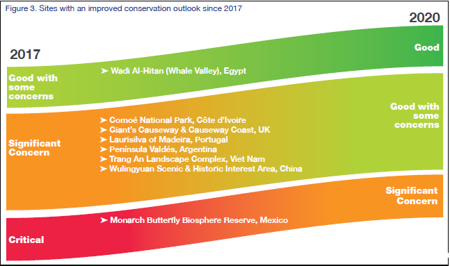 世界遗产中心评价该项目:“中国试点项目卓有成效,项目的开展既符合世界遗产与可持续旅游的国际理念,又具有很强的针对性、实践性和共通性,对中国以至于其他国家都具有重要的启示,具有重要的全球示范意义。”在各级政府、遗产地和项目的共同努力下,世界遗产大会每年对武陵源审议的负面清单日渐减少。2020年12月8日,IUCN向全球发布第三期《世界遗产展望》,武陵源风景名胜区世界自然遗产从第三档“重点关注(significant concern)”成功晋级第二档“较好有部分关注(good with some concerns)”。