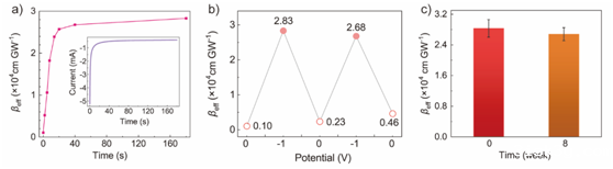 图3. (a) 非线性吸收系数与电化学插层时间的关系,(b) 非线性吸收系数的离子插层/脱嵌循环调控过程,(c) 插层产物非线性吸收性能的时间稳定性。