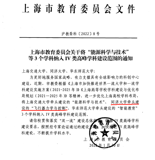 我校“飞行器力学与控制”学科入选上海市Ⅳ类高峰学科建设