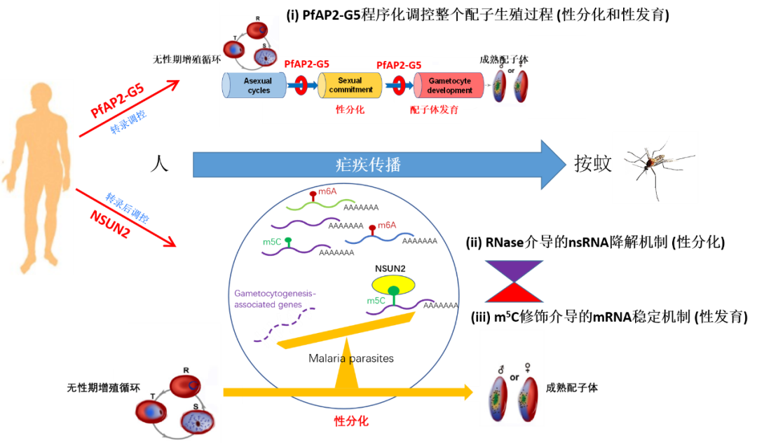 疟疾(malaria)是由疟原虫感染引起的寄生虫病,与艾滋病、结核病并列全球三大传染病之一,全球有近90个国家和地区存在疟疾流行,每年约2.4亿人感染,导致约60多万人死亡。我国虽然实现了消除疟疾目标,但目前仍有大量境外输入病例,如何防止输入再传播是巩固我国消除疟疾成果的关键。疟原虫的生活史需要经历人和按蚊两个宿主,只有成熟的配子体才能通过按蚊传播。因此,疟原虫的配子生殖过程,即在人体内红细胞寄生阶段的无性体向配子体的性分化和发育,是疟原虫感染按蚊的关键,也是疟疾传播的决定性环节。在之前的研究中,张青锋课题组已从转录水平和转录后水平分别揭示了两条调控疟原虫配子生殖的表观遗传调控途径:一是转录抑制因子AP2-G5与转录激活AP2-G协同调控整个配子生殖过程,包括性分化与性发育,直至成熟配子体的产生;二是RNA降解酶如RNase II和Rrp6等通过实时降解靶基因的新生RNA,调控配子生殖过程的启动(性分化)。但是,对于表观转录组是否参与调控疟原虫配子生殖,目前尚不清楚。