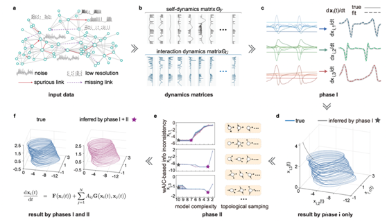 以往的研究着重于单节点或少量节点动态方程的推理,对于包含大量节点的复杂网络系统而言,这个问题面临更多挑战。例如,不仅节点活动数据含有噪声,而且网络结构数据可能不准确,节点的自身动力学可能具有异质性,系统宏观行为可能会掩盖节点之间动态耦合的微观机制。为了克服这些挑战,研究团队融合全局和局部两个视角,提出了新的复杂系统自主推理框架(图1)。该算法能够高效、准确地从观测数据中推理出隐藏的网络动力学方程,为自动化地发现复杂系统的底层原理提供了有效的新途径。