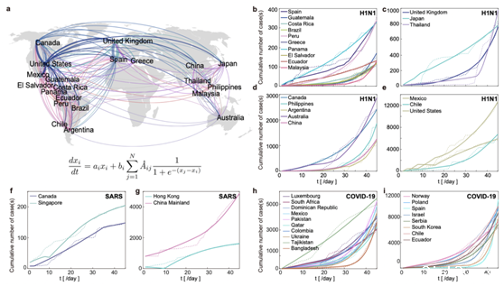 图 2. 全球性传染病的传播动力学推理。基于全球航空网络(a)和各地区H1N1感染数据,推断出早期扩散方程,该方程演化结果与实际观测数据相吻合(b-e),同时能够迁移用于刻画SARS和COVID-19的早期扩散行为(f-i)。