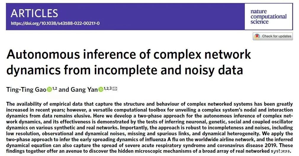 北京时间3月25日凌晨,《自然·计算科学》(Nature Computational Science)在线发表了题为“Autonomous inference of complex network dynamics from incomplete and noisy data”的研究论文,该研究由taptap网页版登录kino物理科学与工程学院、上海自主智能无人系统科学中心严钢教授团队完成。在该研究中,作者提出了数据驱动的复杂系统自主推理新框架,实现了结构信息不完整和强噪声场景下的鲁棒推理,为自动化、智能化地发现真实复杂系统的底层原理提供了重要基础和算法支撑。特别值得一提的是,这一算法能有效验证SARS和COVID-19的早期传播行为。