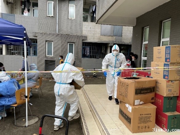 大楼突发疫情被封控,感染的风险就在身边。作为大楼的一份子,心系大楼内600多名学生,学院2020级学本科生高逸轩、朱洵缘毅然穿上闷热的防护服,戴上不透气的塑胶手套,搬运牛奶、矿泉水、医用物资,一口气搬完近60箱的物资,汗水早已浸湿衣衫,他们顾不上擦一把汗,又马上帮忙把物资分发到每个学生手中。