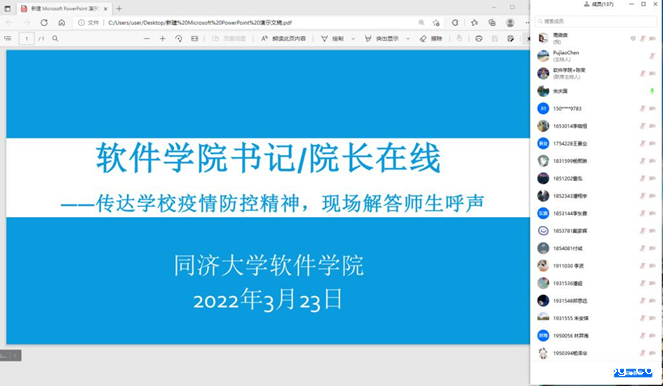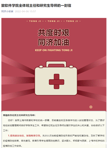 学院党委还先后发布《告软件学院同学书》《致软件学院全体班主任和研究生导师的一封信》,号召大家以“同济天下”的情怀积极参与抗疫;发布了《致抗击新冠肺炎疫情学子的慰问信》《致软件学院抗疫志愿者的慰问信》,对学院正在感染新冠、隔离观察和一线志愿者的学生进行关怀慰问。学院每周开展一次“书记院长面对面”线上交流会,畅通与广大师生互动交流的渠道,积极解答解决广大师生关心的问题。多措并举,压实责任,坚决守牢校园疫情防控阵地,保障师生健康安全。